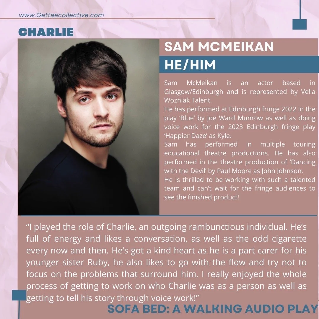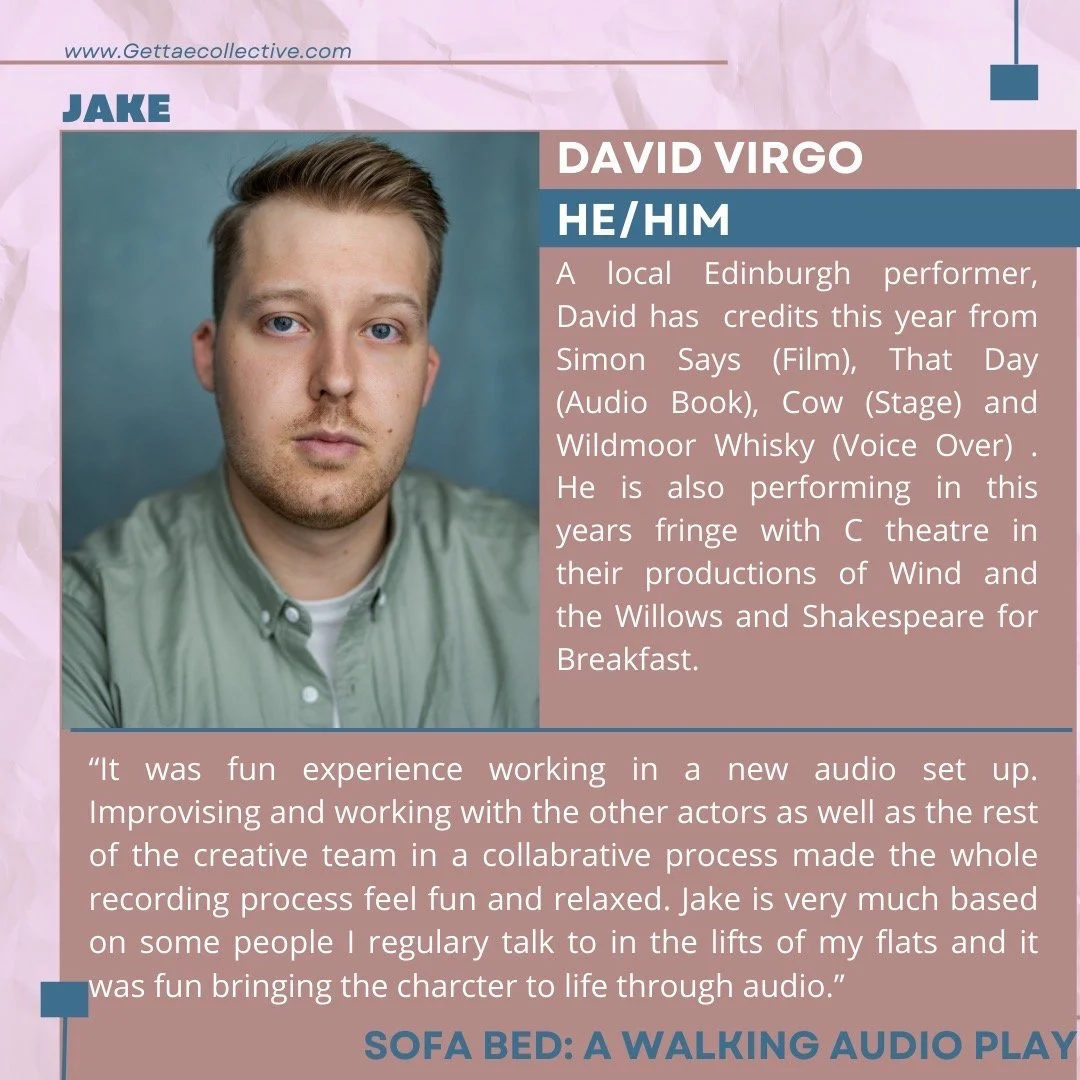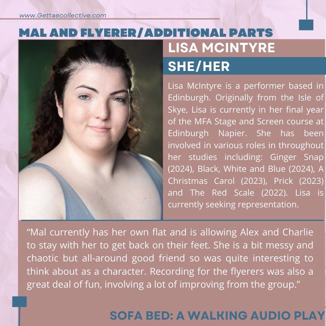 This audio play allows the audience to follow the characters as they move across Edinburgh with the sofa bed, delivered through an app, with walking directions through Edinburgh - Starting at the Meadows, ending at Holyrood Park.