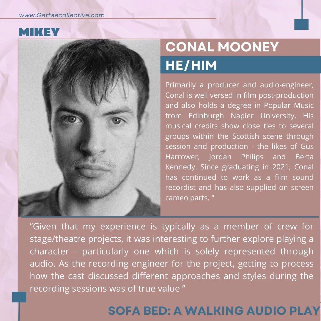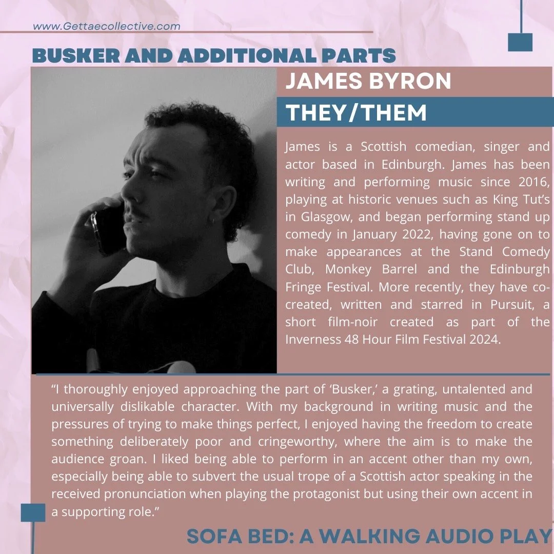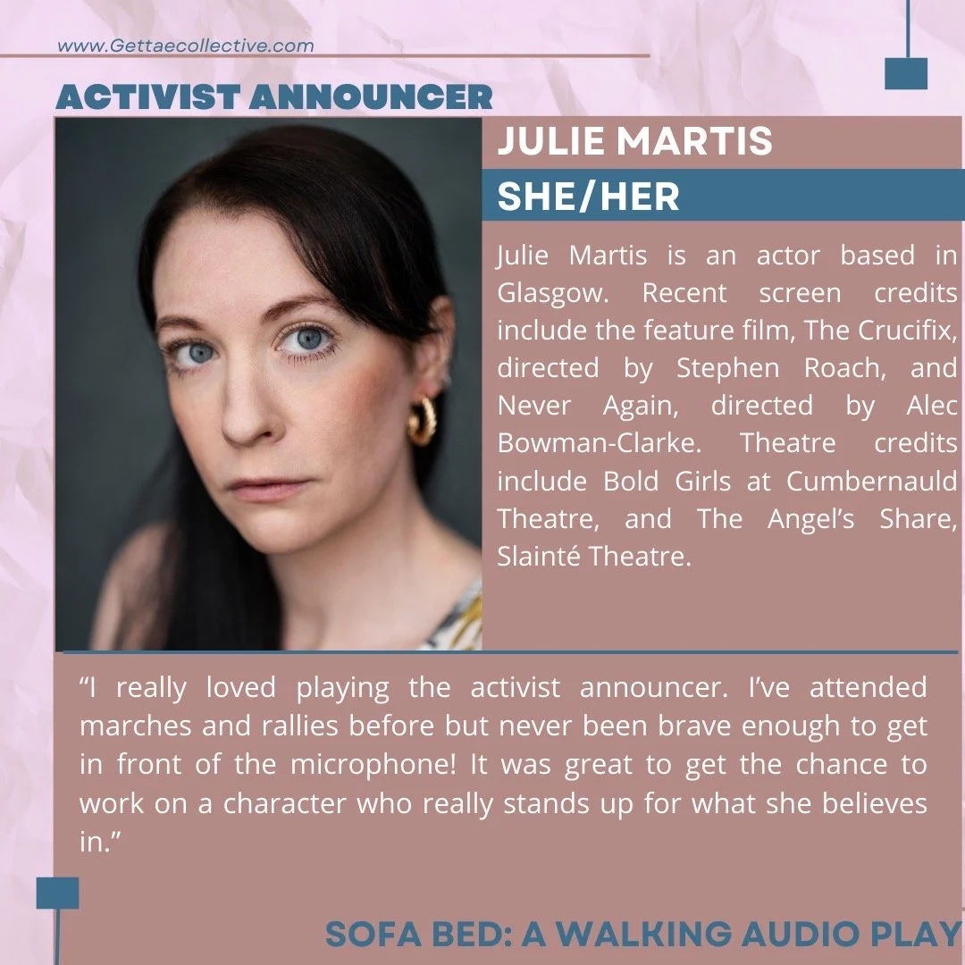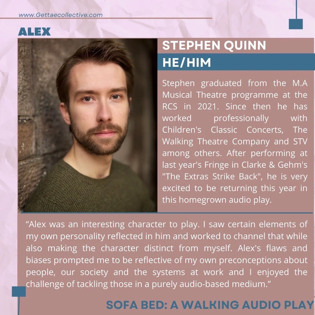 This audio play allows the audience to follow the characters as they move across Edinburgh with the sofa bed, delivered through an app, with walking directions through Edinburgh - Starting at the Meadows, ending at Holyrood Park.